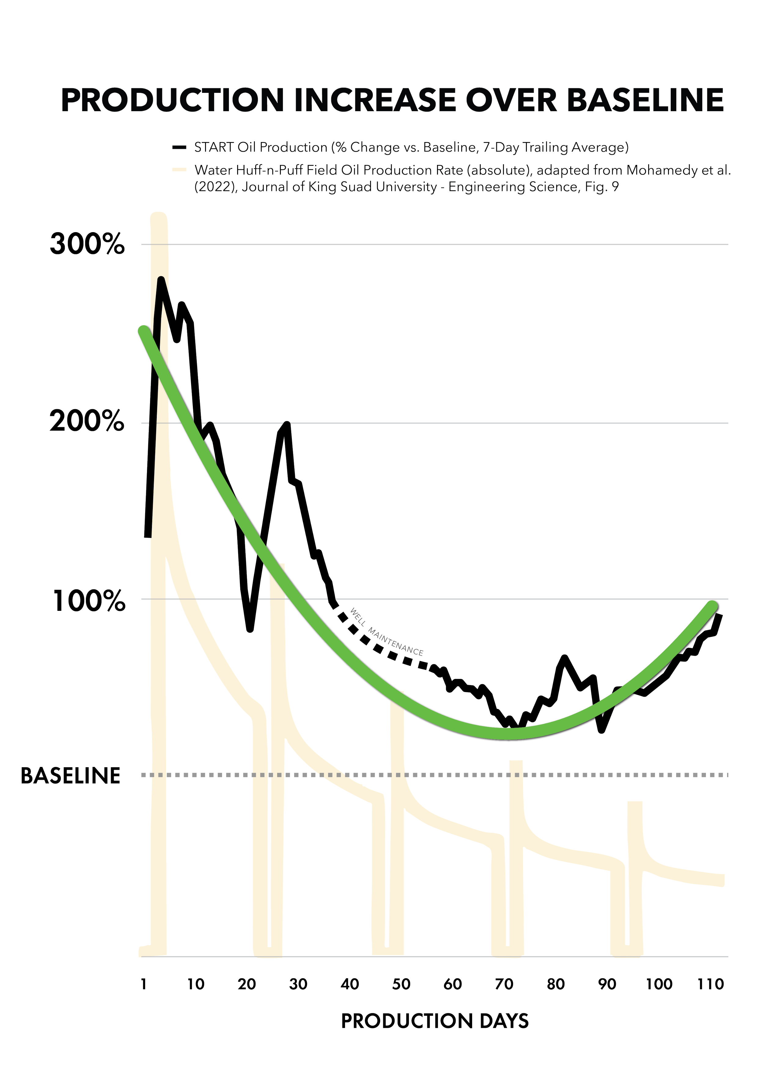 As wells mature, production declines - but most of the oil remains. Enhanced recovery methods either can't access tight formations at all, or deliver a sharp peak followed by rapid decline - producing too little incremental oil to justify the investment. START solves both problems: it increases production and that increase is sustained. In the field, production to date is 90% above baseline and continues to grow.